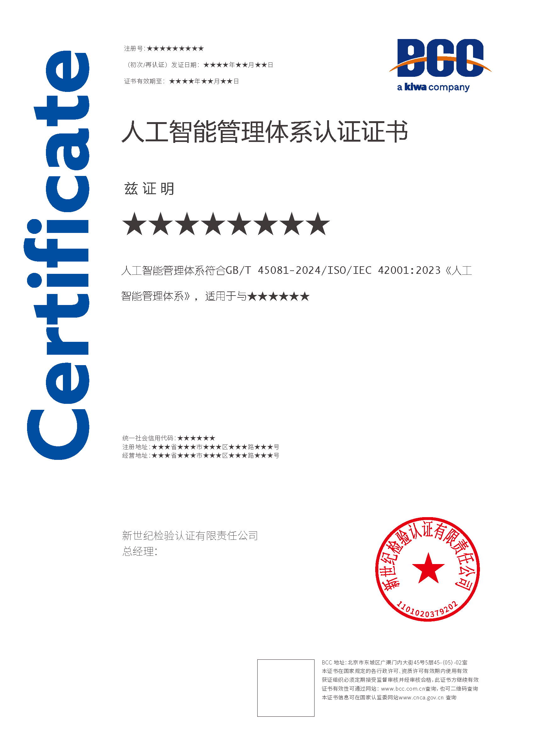 本頁涉及的認證服務中均有對應的《認證實施規(guī)則》,BCC擁有其最終解釋權。任何組織及個人未經BCC許可,不得以任何形式全部或部分使用(法律要求除外)認證相關信息。如需獲取相關實施規(guī)則請用以下方式聯(lián)系獲?。弘娫挘?10-58579316 郵箱:fwjs@kiwa.cn