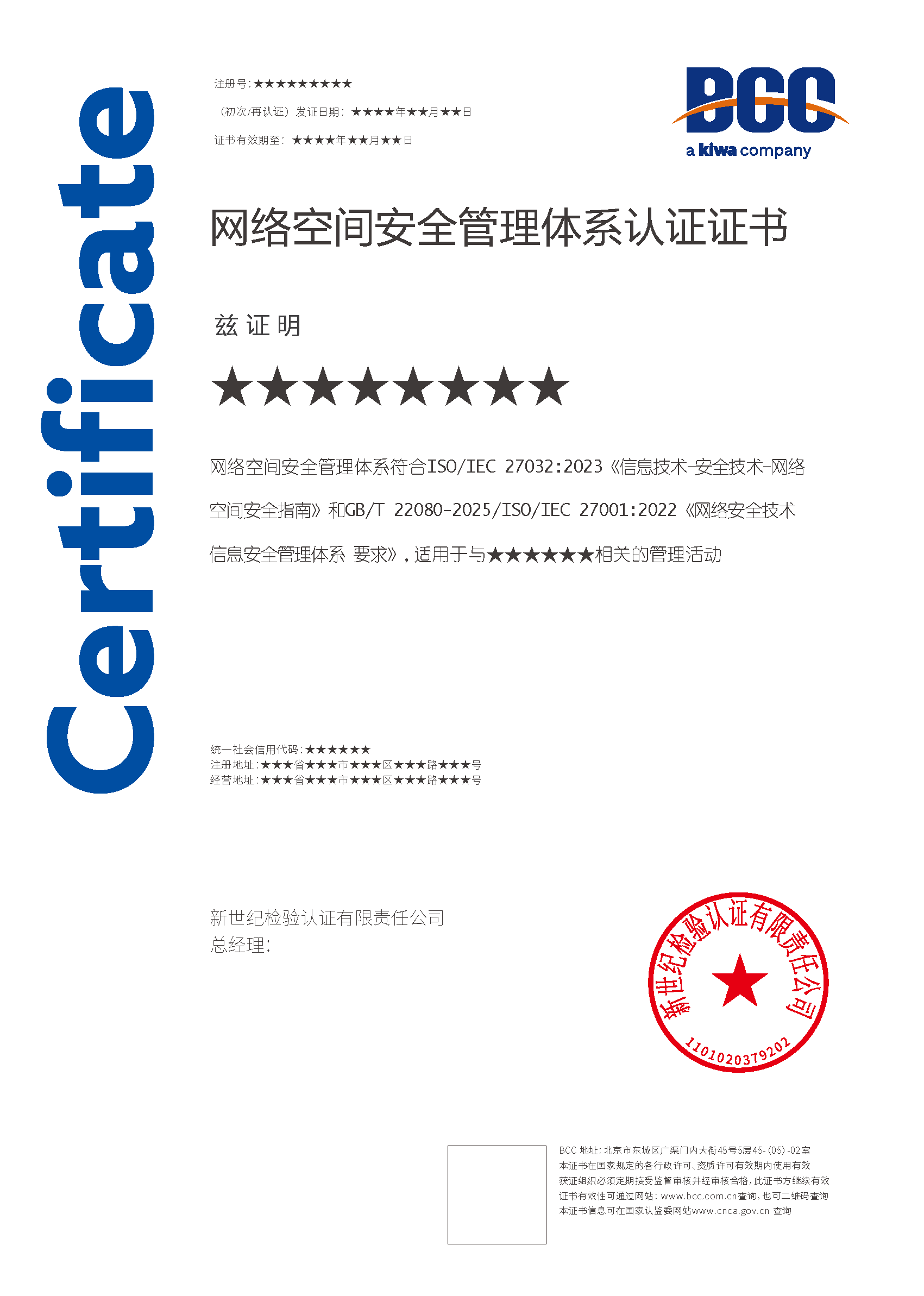 本頁涉及的認(rèn)證服務(wù)中均有對應(yīng)的《認(rèn)證實(shí)施規(guī)則》,BCC擁有其最終解釋權(quán)。任何組織及個(gè)人未經(jīng)BCC許可,不得以任何形式全部或部分使用(法律要求除外)認(rèn)證相關(guān)信息。如需獲取相關(guān)實(shí)施規(guī)則請用以下方式聯(lián)系獲?。弘娫挘?10-58579316 郵箱:fwjs@kiwa.cn
