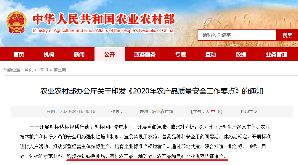 通知對(duì)于“加強(qiáng)綠色食品、有機(jī)農(nóng)產(chǎn)品、地理標(biāo)志農(nóng)產(chǎn)品認(rèn)證和管理,實(shí)施地理標(biāo)志農(nóng)產(chǎn)品保護(hù)工程,培育打造200個(gè)地理標(biāo)志農(nóng)產(chǎn)品。”的描述,要全面提高農(nóng)產(chǎn)品質(zhì)量安全水平。