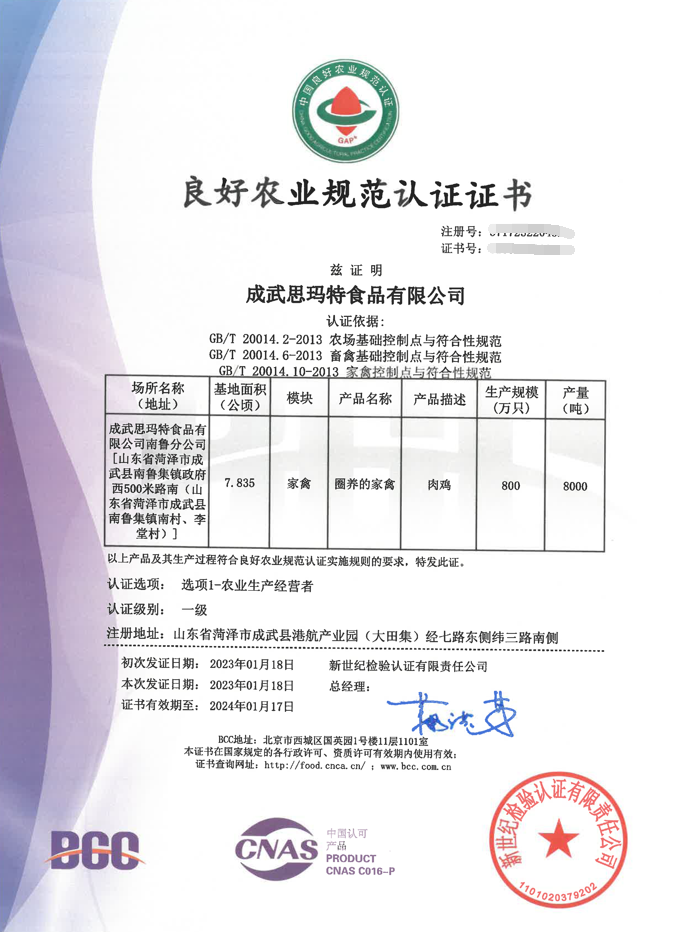 讓雞肉產(chǎn)品更具競爭力!成武思瑪特通過BCC實施的GAP(家禽模塊)認(rèn)證