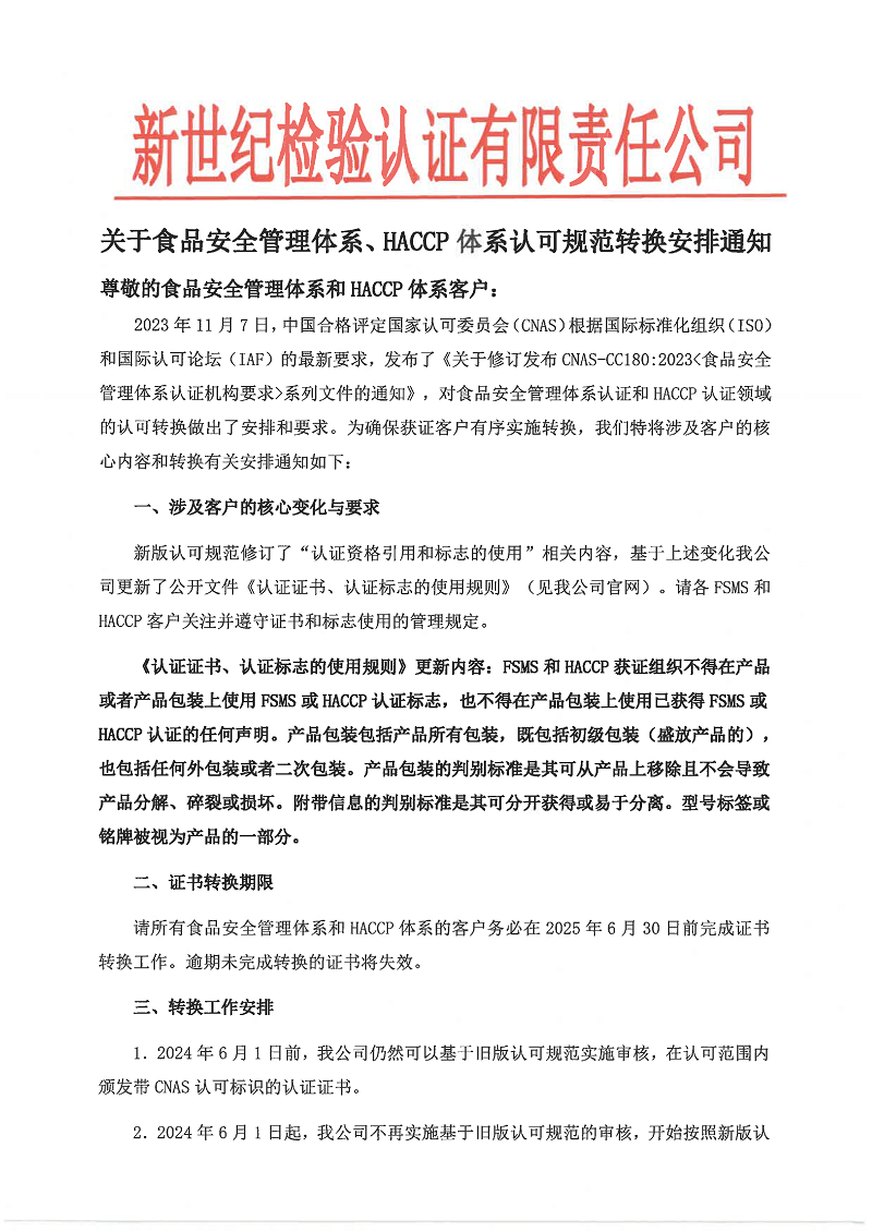 2023年11月7日,中國合格評定國家認(rèn)可委員會(CNAS)根據(jù)國際標(biāo)準(zhǔn)化組織(ISO)和國際認(rèn)可論壇(IAF)的最新要求,發(fā)布了《關(guān)于修訂發(fā)布CNAS-CC180:2023<食品安全管理體系認(rèn)證機構(gòu)要求>系列文件的通知》,對食品安全管理體系認(rèn)證和HACCP認(rèn)證領(lǐng)域的認(rèn)可轉(zhuǎn)換做出了安排和要求。為確保獲證客戶有序?qū)嵤┺D(zhuǎn)換,我們特將涉及客戶的核心內(nèi)容和轉(zhuǎn)換有關(guān)安排通知如下: